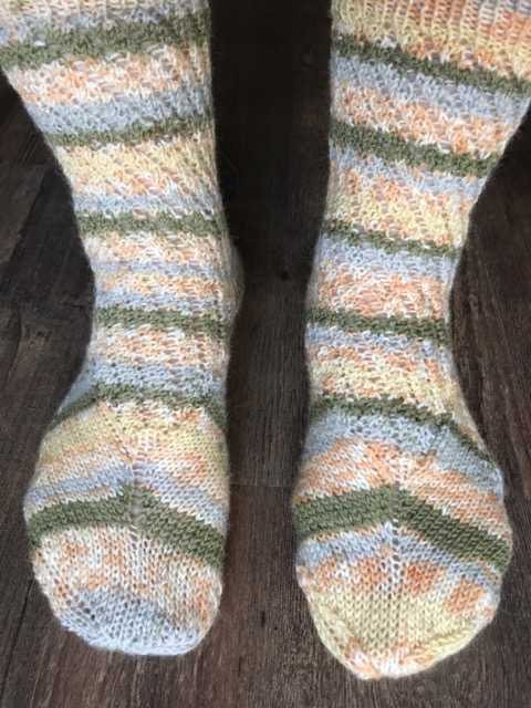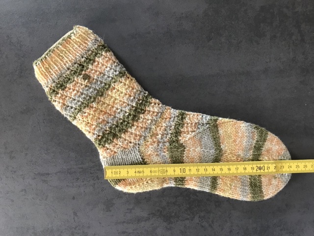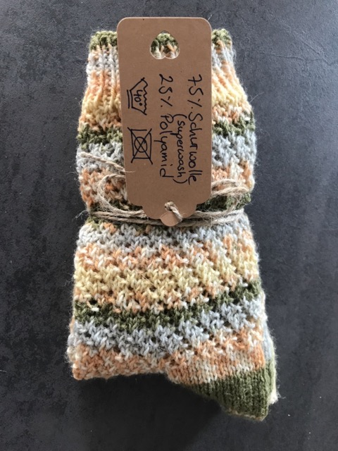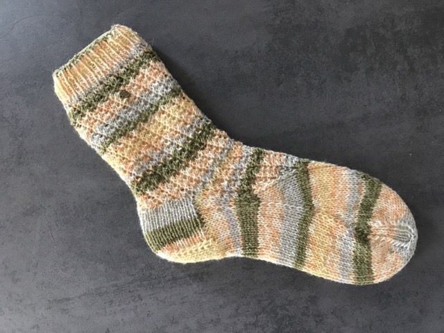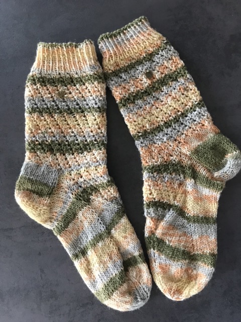 Luftige Socken in der griffigen, strapazierfähigen Sockenwolle Dolomiti von Lana Alzetta in gelb-grün-grau. Die beiden Socken sind farblich NICHT gegengleich (siehe Fotos).