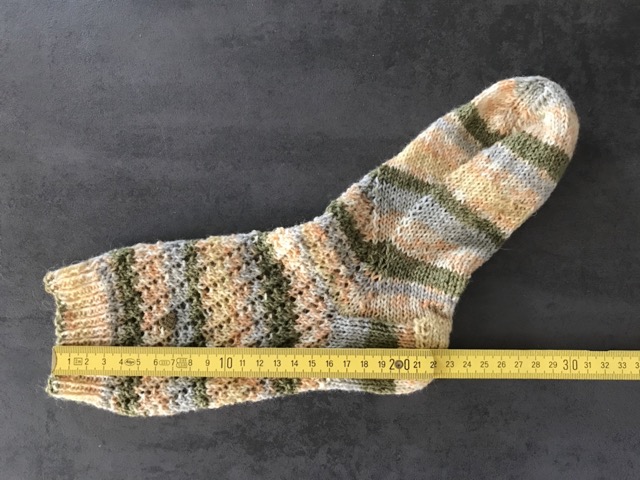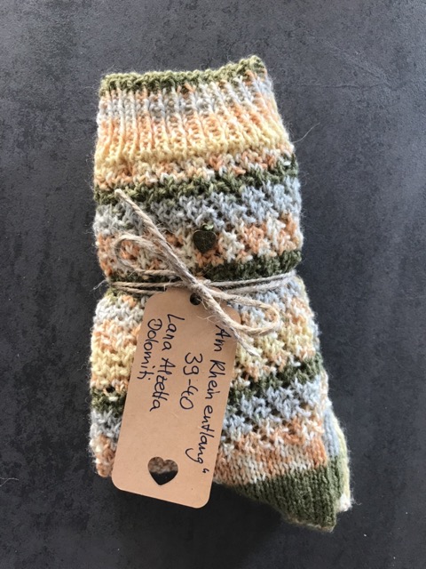 Das Muster „Rhein“ dreht sich um den Schaft und läuft auf dem Fuß spitz aus. Die Socken sind nicht zu dick, sodass man sie prima in normalen Halbschuhen tragen kann. Durch die Hebemaschen entsteht ein Lochmuster, das die Socken luftig frisch macht.
