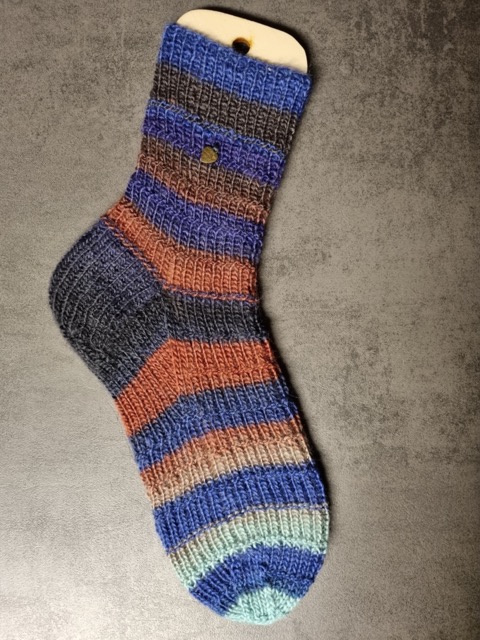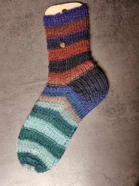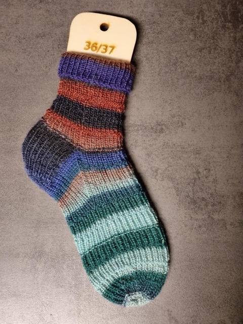 Superweiche Socke mit Blockstreifen, diie sich durch die extra langen Farbverläufe ergibt. Magic Sock Wool ist ein einfädiges Garn, d.h. es ist nicht aus mehreren Fäden versponnen. Die rustikale Struktur erinnert an handgesponnenes Garn mit natürlichen Variationen in der Dicke. So bekommt es eine wunderbare Weichheit und eine unglaubliche Farbtiefe. Die beiden Socken sind NICHT gegengleich (siehe Fotos).