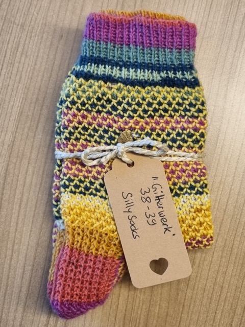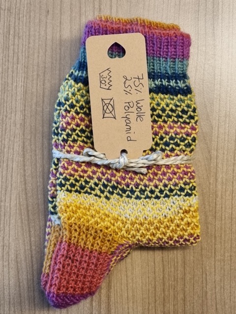 Warme bequeme Socken aus der Sockenwolle Silly Socks. Die Mischung aus Superwash-behandelter Wolle und Polyamid hält die Füße warm und kuschelig, während die Socken ebenso widerstandsfähig und robust sind. Die beiden Socken sind farblich NICHT gegengleich (siehe Fotos).
