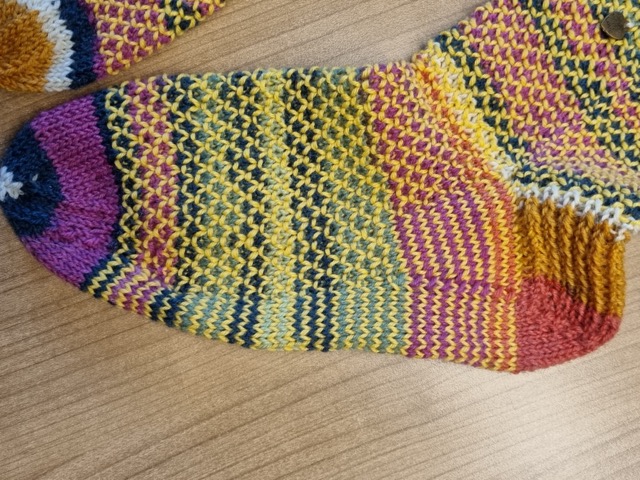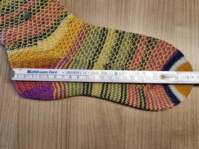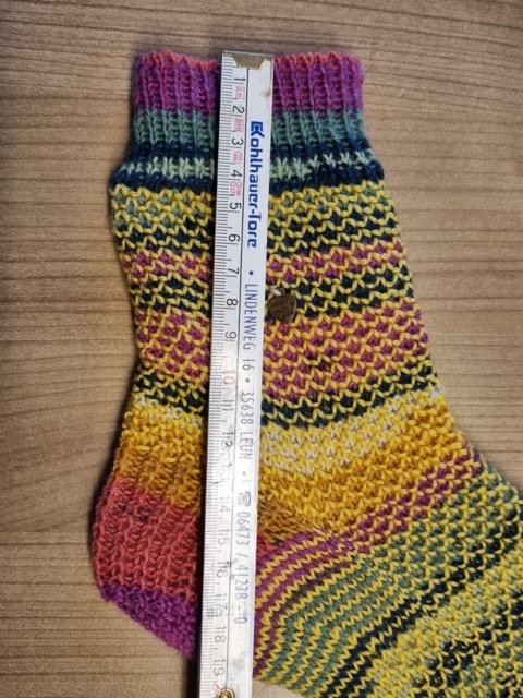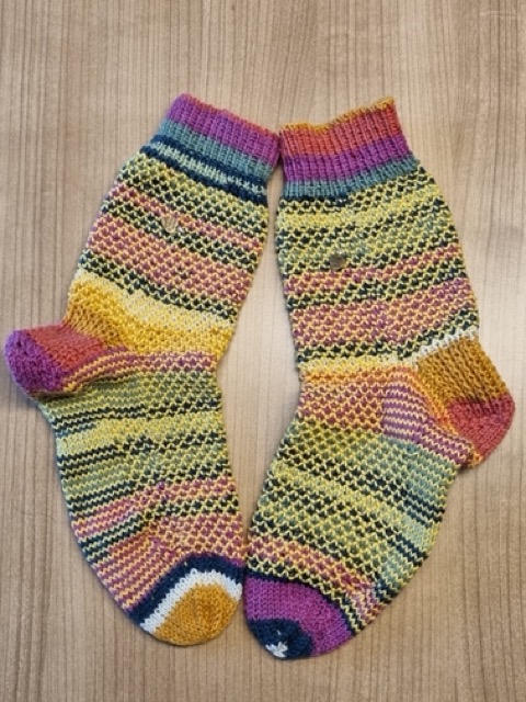 Das Muster Gitterwerk legt über die bunten Grundfarben ein gelbes Gittermuster, die Fußunterseite ist glatt gestrickt. Die Socken sind nicht zu dick, sodass man sie prima in normalen Halbschuhen tragen kann. Aber auch schön wärmend, dass sie sich für zuhause auf dem Sofa oder auch als Bettsocken eignen.