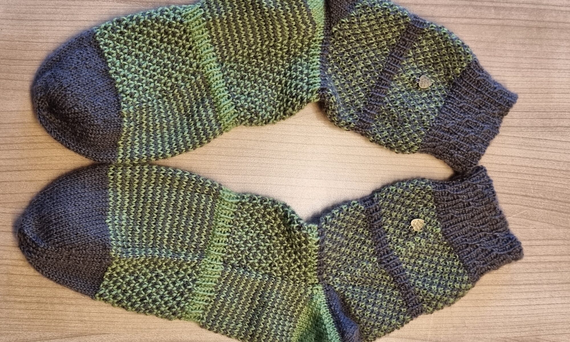 Das Muster Waldgnom mischt die braune und grüne Farbe in Netz- und Streifenmustern und die Bumerangferse ist zweifarbig gestrickt. Das besondere Bündchen hat ein leichtes Zopfmuster. Die Socken sind nicht zu dick, sodass man sie prima in normalen Halbschuhen tragen kann. Aber auch schön wärmend, dass sie sich für zuhause auf dem Sofa oder auch als Bettsocken eignen.